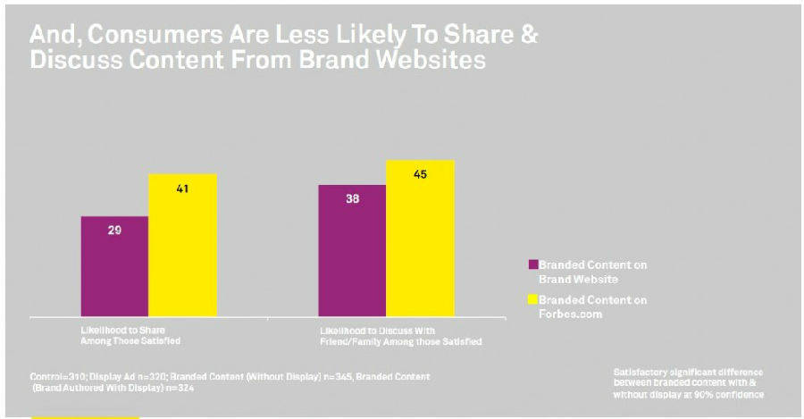 原生廣告的效果跟其發布的平臺也有很很大的聯系。研究發現發布在品牌自己網站上的原生內容用戶分享的意愿不如發布在forbes上面的原生內容,在Forbes上面的原生內容用戶分享度要高41%。可見如果品牌的內容發布在更加真實可信的網站上會增加用戶的分享意愿,但這也是原生廣告招致批評的地方,混淆了內容跟廣告的區別,透支了用戶對網站和編輯的信任度。