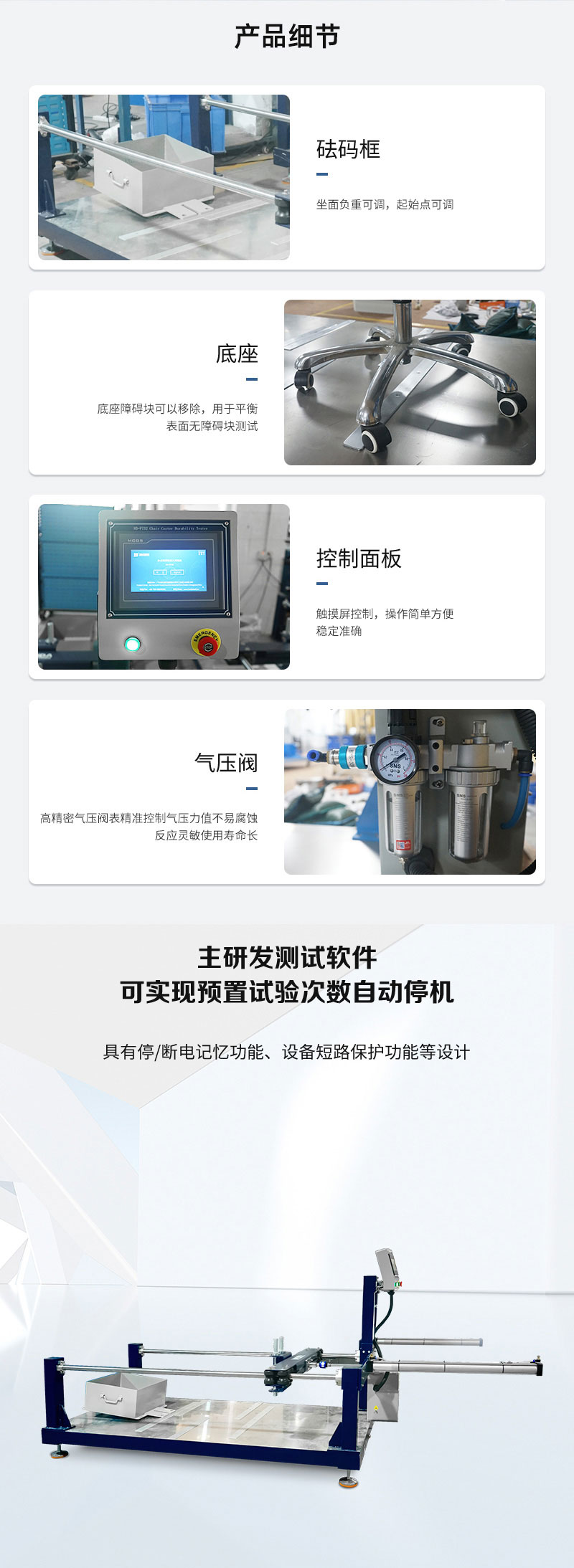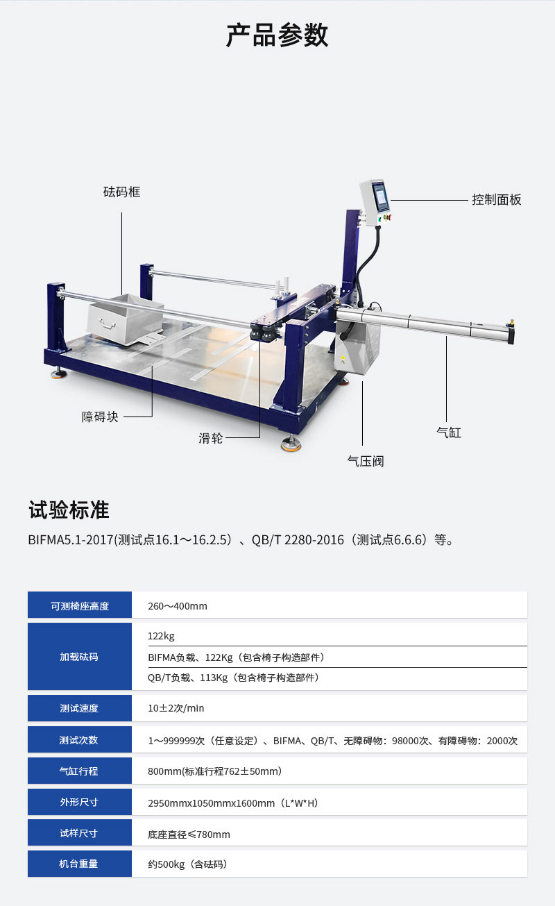 辦公椅輪子耐磨試驗儀適用于帶輪辦公椅等家具類產品,測定辦公椅輪子及底座前后往返運動疲勞測試,通過檢測辦公椅腳輪耐磨性情況,來提高產品的品質。