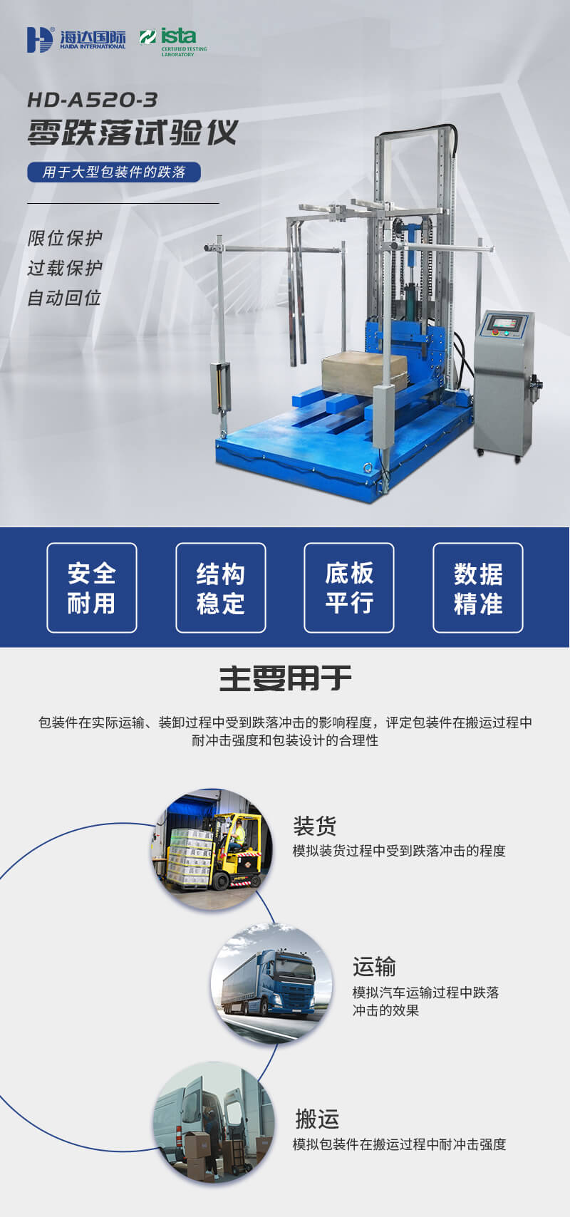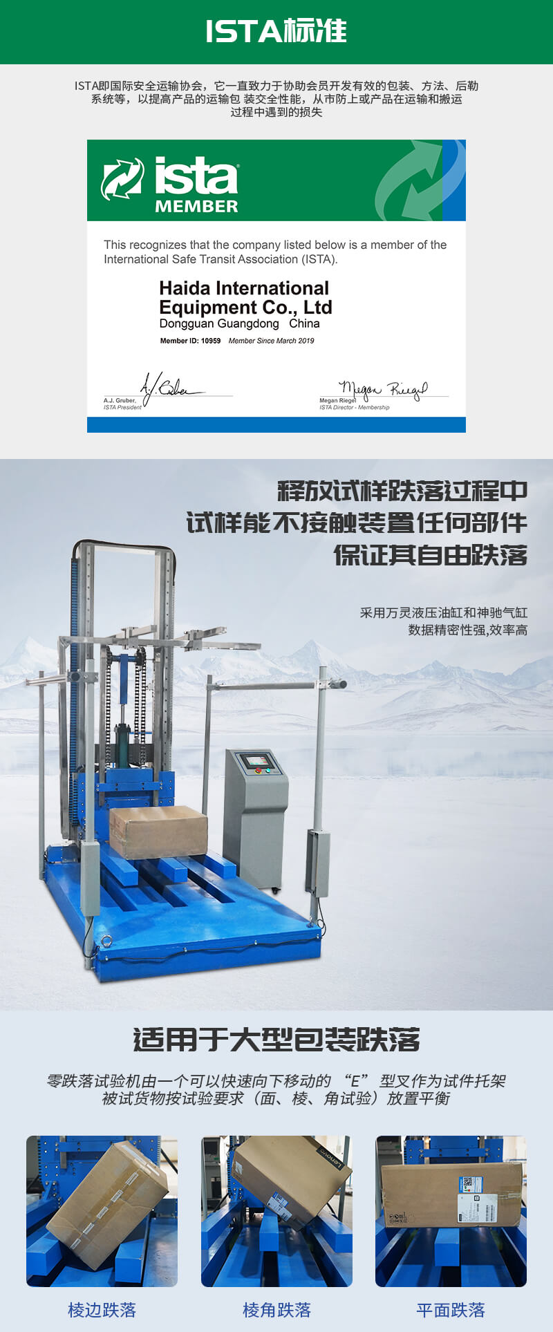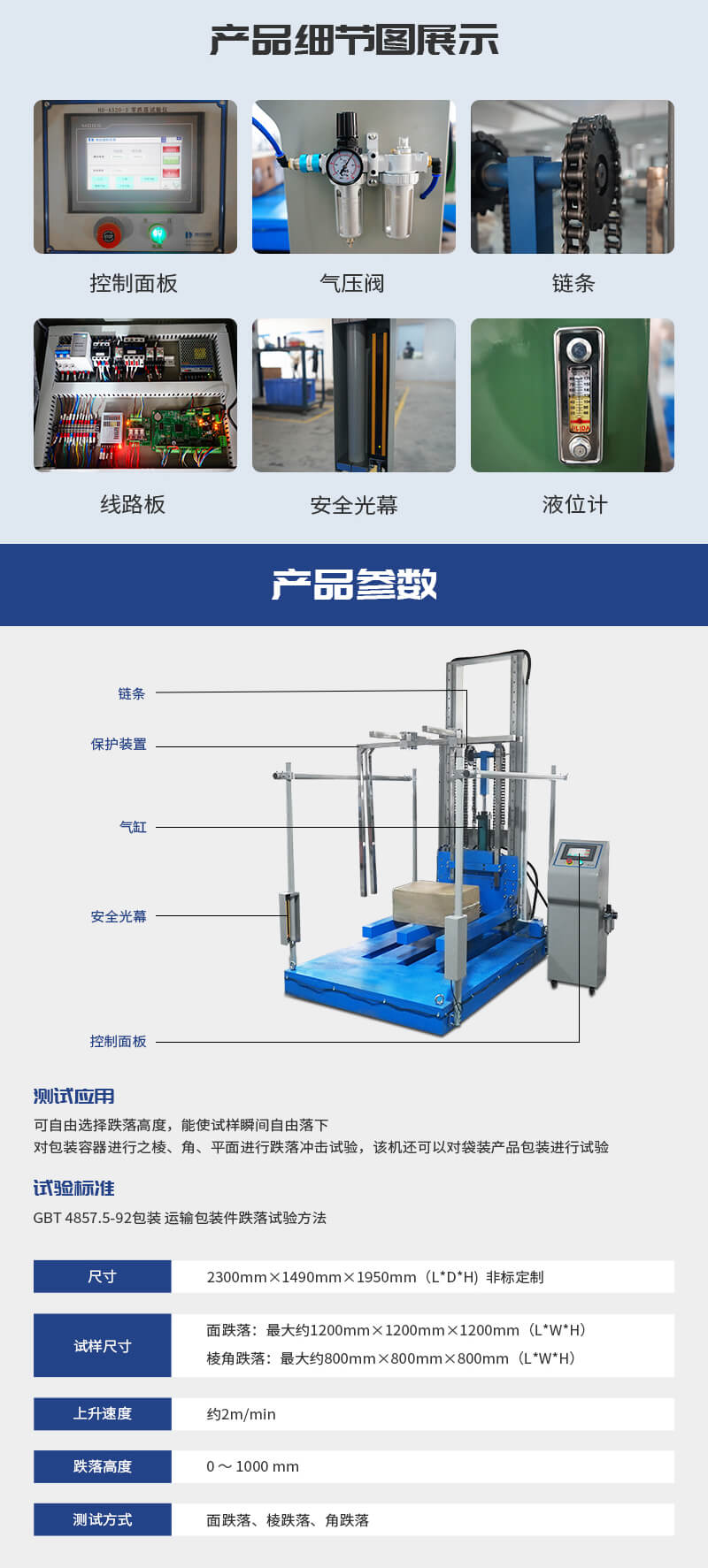 測試各類包裝材料/冰箱/桌椅/箱柜等的抗跌落沖擊損壞的能力 |