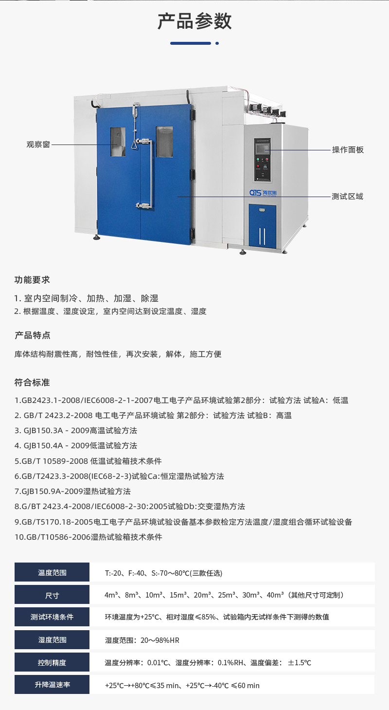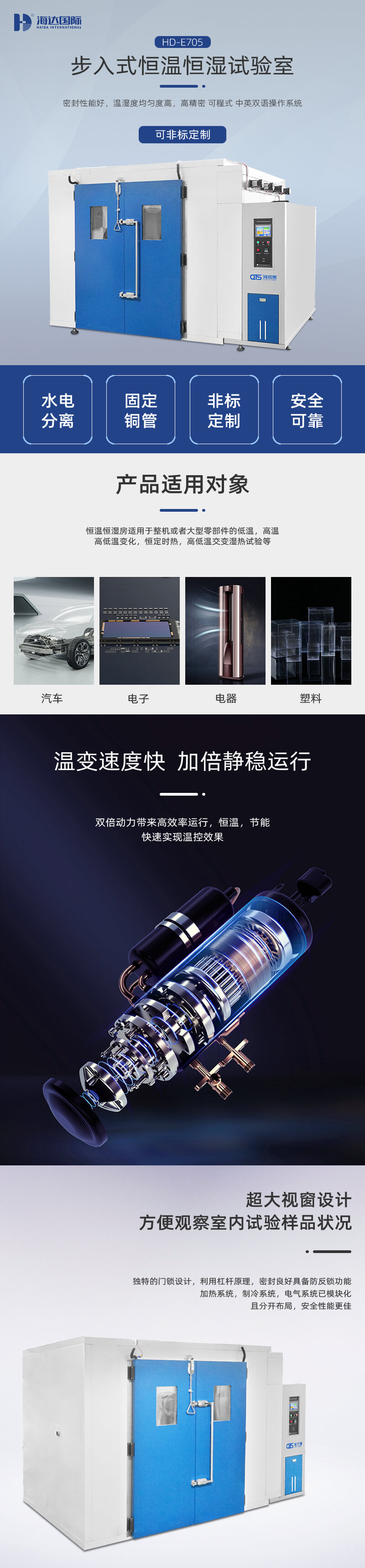 恒溫恒濕試驗(yàn)房又名步入式恒溫恒濕試驗(yàn)室,適用于整機(jī)或大型零部件的低溫、高溫、高低溫變化、恒定濕熱、高低溫交變濕熱試驗(yàn)等。可根據(jù)用戶要求改變工作室尺寸與功能等;拼塊式箱體,造型美觀大方;科學(xué)的風(fēng)道設(shè)計(jì),能滿足不同客戶的需求;采用觸摸屏,PLC程控器。