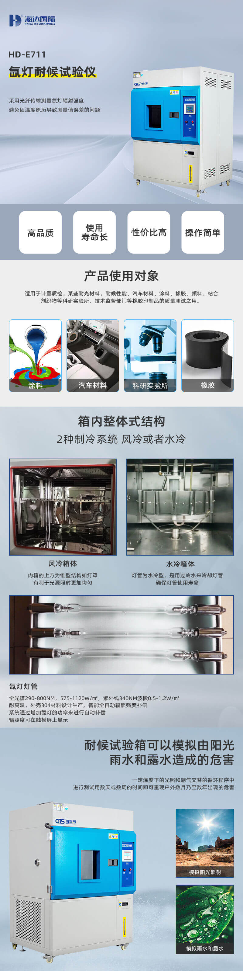 氙燈老化試驗箱模擬全陽光光譜的氙弧燈再現不同環境下存在的破壞性光波,SN型氙燈耐氣侯試驗箱可用于新材料的選擇、改變現有材料或評估材料組成變化后耐用性的變化試驗,可以很好的模擬在不同環境條件下,材料暴露在陽光下所產生的變化。