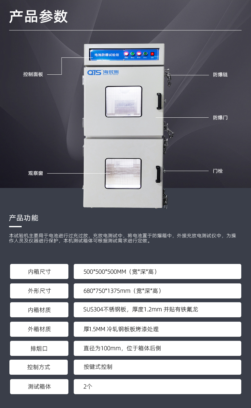 電池防爆試驗箱主要用于電池進行過充過放,充放電測試中,將電池置于防爆箱中,外接充放電測試儀中,為操作人員及儀器進行保護,本機測試箱體可根據測試需求進行定做。