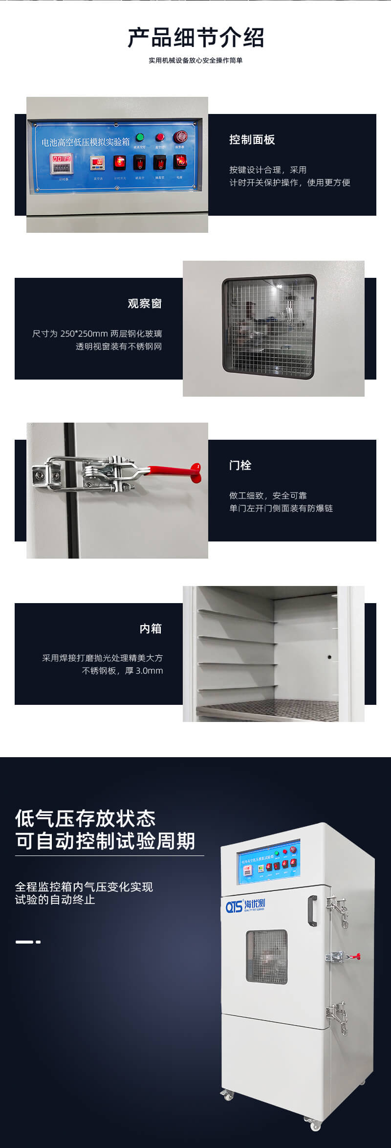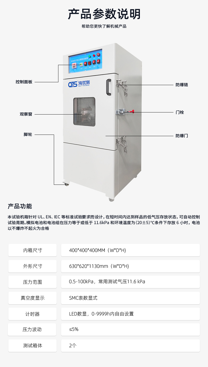 電池高空低壓模擬試驗箱針對UL、EN、IEC等標準試驗而設(shè)計,在短時間內(nèi)達到樣品的低氣壓存放狀態(tài),可自動控制試驗周期,全程監(jiān)控箱內(nèi)氣壓變化,實現(xiàn)試驗的自動終止。模擬電池和電池組在壓力等于或低于11.6kPa和環(huán)境溫度為(20±5)℃條件下存放6小時,電池以不爆炸不起火為合格。